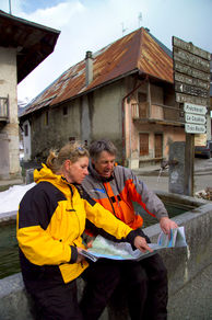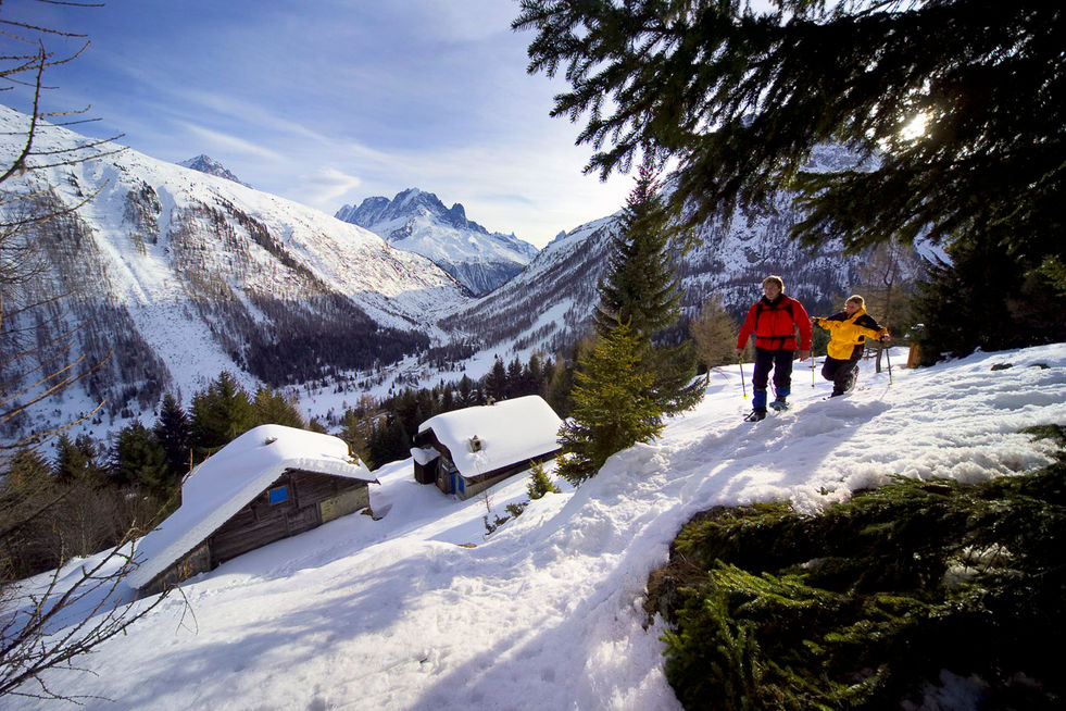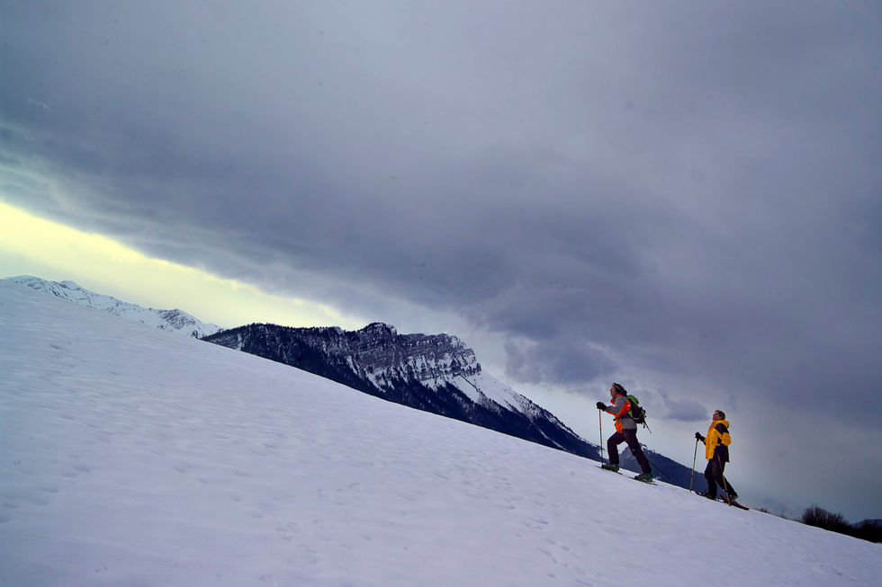 Jarsy, Massif des Bauges, Haute savoie, France. Snowshoeing is the fastest growing alpine winter sport in Europe. The tiny village of Jarsy offers a great base for some spectacular outdoor activities all year round. In the winter the snowy white landscapes and regular blue skies make snow shoeing a perfect option for a day outing.