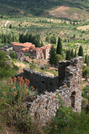The well-preserved, 14th-century Conventof Pantanassa. This features a beautifully ornate stone-carved facade and is still maintained by nuns, Mystras’ only inhabitants. Mystras, the 'wonder of the Morea', was built as an amphitheatre around the fortress erected in 1249 by the prince of Achaia, William of Villehardouin. Reconquered by the Byzantines, then occupied by the Ottoman Turks and the Venetians, the city was abandoned in 1832, leaving only the breathtaking medieval ruins, standing in a beautiful landscape. The Peloponnese peninsula is the real heart of traditional Greece. Ancient mountain villages interrupt the olive groves that line the rugged coastline that is surrounded by deep blue and turquoise waters of the Mediterranean.